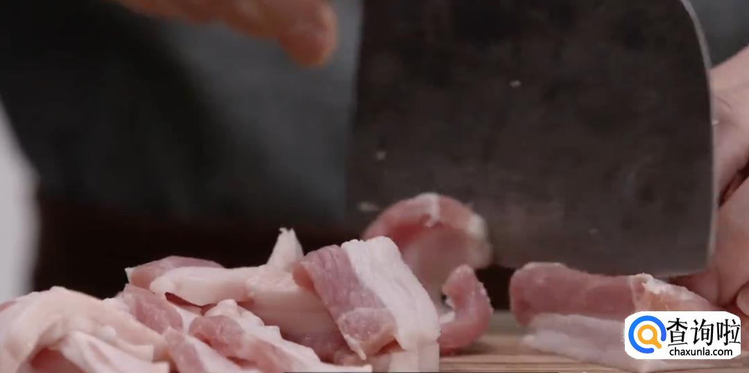 选去皮的三层五花肉,切成5毫米左右的薄片。