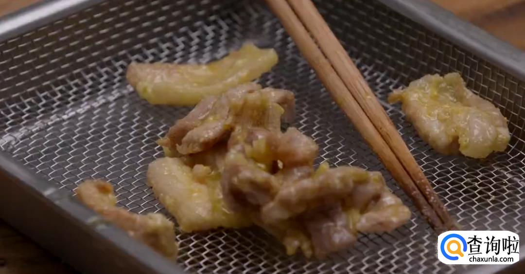 热锅起油,油温六成熟的时候,下肉片翻炸,等肉片成熟后捞出沥干。
