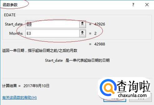 弹出"函数参数"对话框,在文本框输入函数参数。如图所示,完整公式为"=EDATE(D3,E3)-1"。