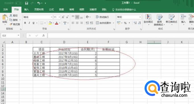按照项目资料创建工作簿文档,如图所示。本例要求编制工程进度计划,计算单项工程的合同到期时间。
