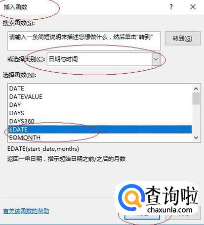 弹出"插入函数"对话框,如图所示。点击"搜索函数或选择类别"向下箭头,选择"日期与时间→EDATE"函数。