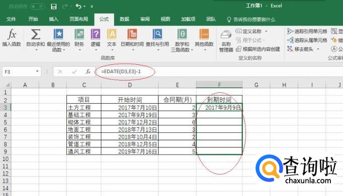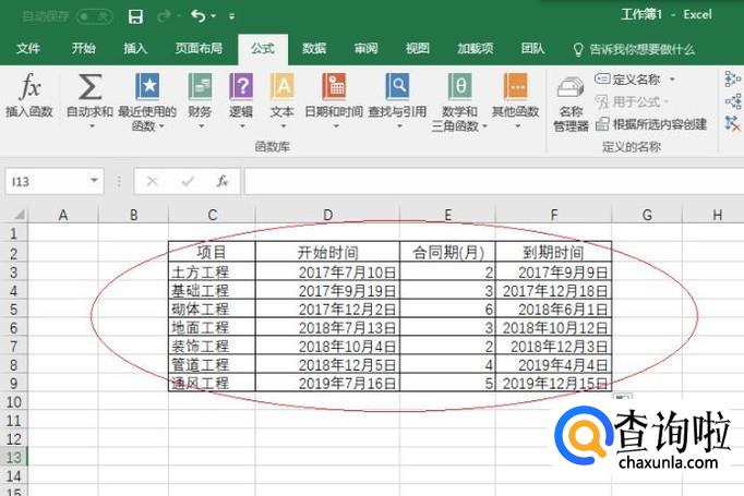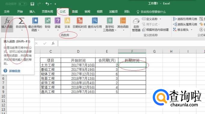 如图所示,选中合同到期时间单元格。选择"公式→函数库"功能区,点击"插入函数"图标。