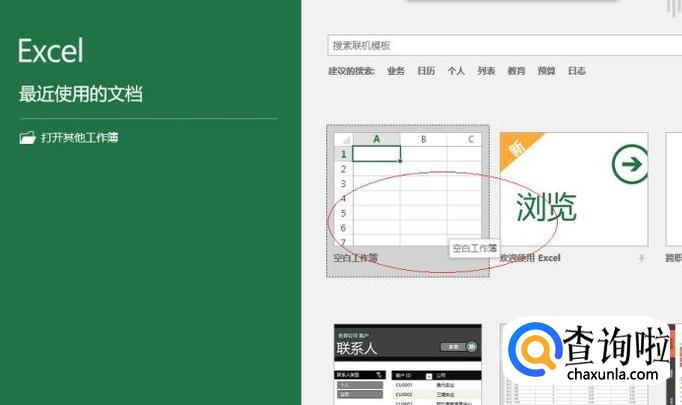 启动Excel 2016电子表格应用程序,如图所示点击界面右侧新建空白工作簿。