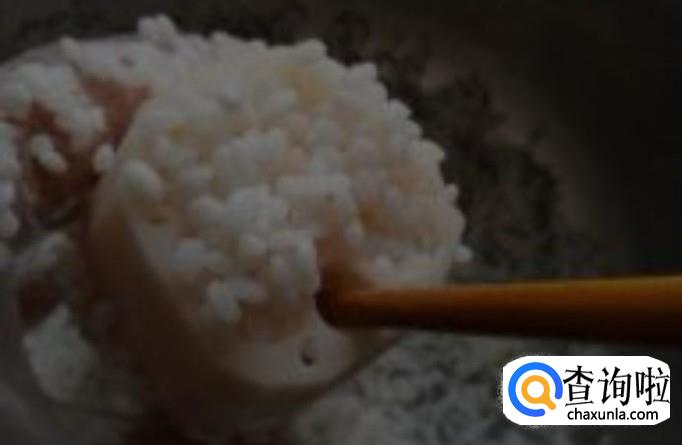 将糯米装入“藕洞”中,每一个洞中加一些水,然后再将刚刚切掉的盖盖上,用牙签将其插紧,使糯米不会倒出来