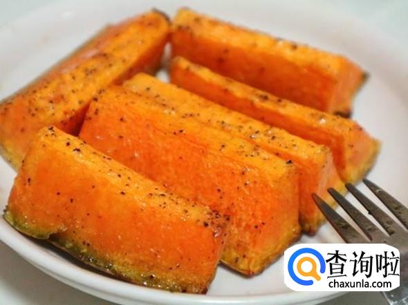 将南瓜去皮、去籽,切成块状,然后撒上橄榄油和胡椒粉,放到预热好的烤箱里烤30分钟。