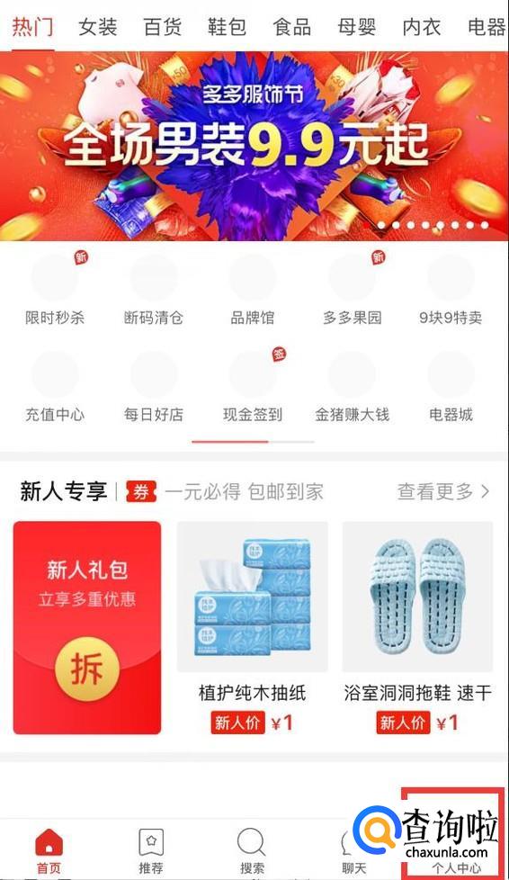 打开拼多多,点击右下角的“个人中心”。