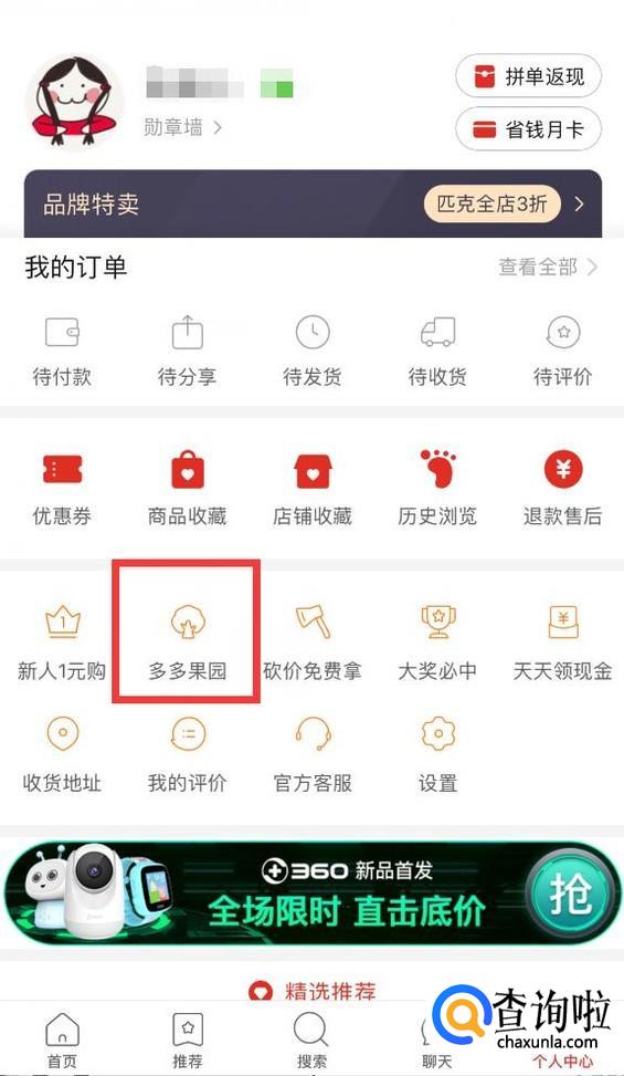 进入个人中心后,选择页面上的“多多果园”。
