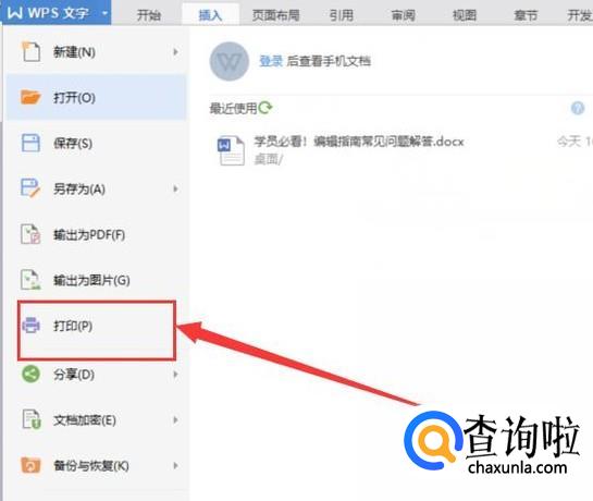点击左上角的“WPS文字”然后选择“打印”,如图所示。
