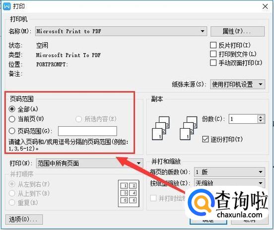 在页码设置区域内对需要打印的页数进行设置即可,如图所示。
