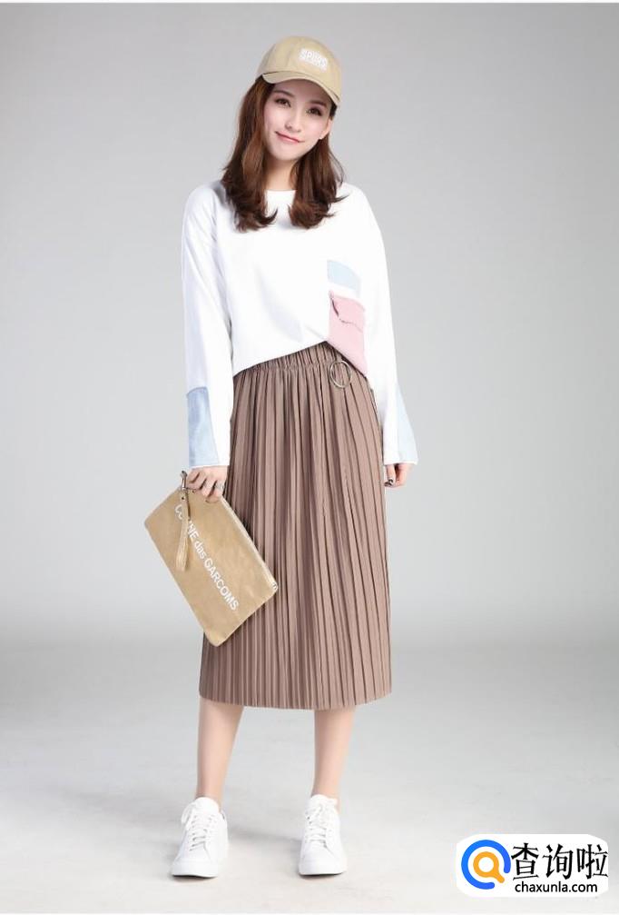 百褶裙配T恤。这种搭配非常适合学生,既有休闲的感觉,又有小清新的感觉,年龄大一些的美眉也可以试试这种搭配,会很减龄呢。