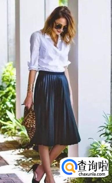 百褶裙配衬衫。衬衫有一种正式的感觉,而百褶裙配衬衫的搭配方式让具有正式感的衬衫多了一丝温柔。