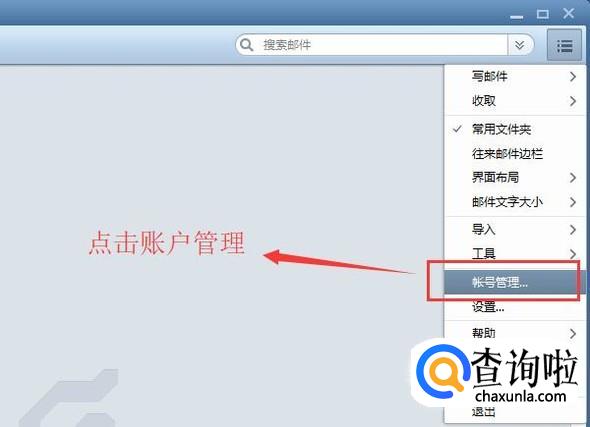 首先打开Foxmail客户端,点击右上角的按钮,然后选择账号管理选项,如下图所示