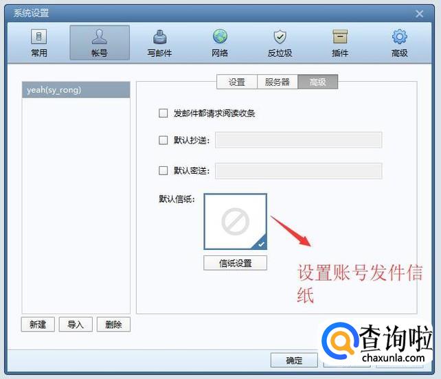 最后切换到高级选项,可以根据自己的需要配置一下邮箱账户的默认信纸样式,如下图所示