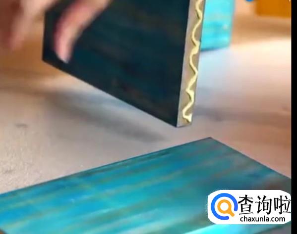 等到染料干了以后在木板侧面涂上白乳胶。用另一个木板与它拼接成直角型。