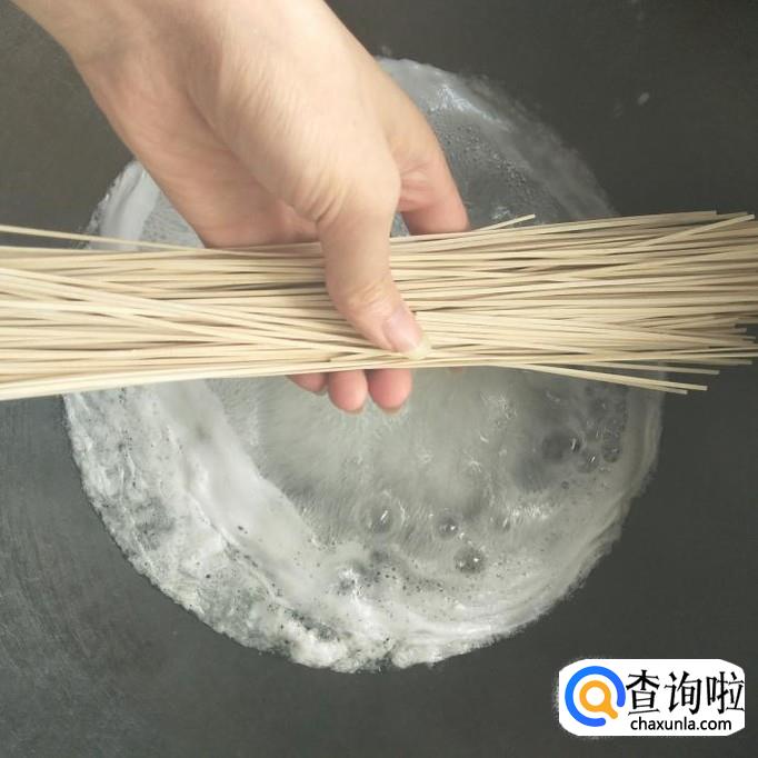 水开后,我们向其中加入适量的面条,然后用筷子搅拌均匀,防止面条黏在一块,难以煮熟