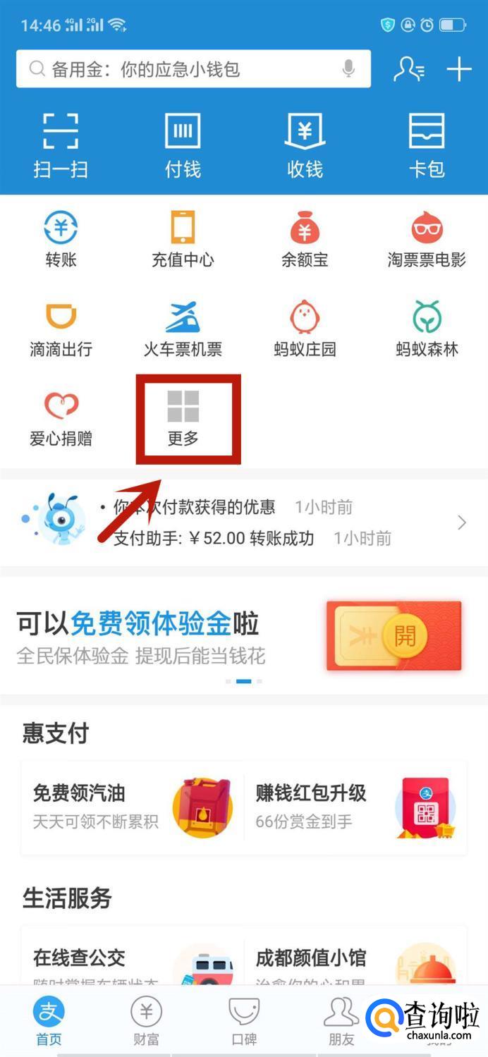 进入支付宝APP主页面,点击更多对花呗进行搜索。
