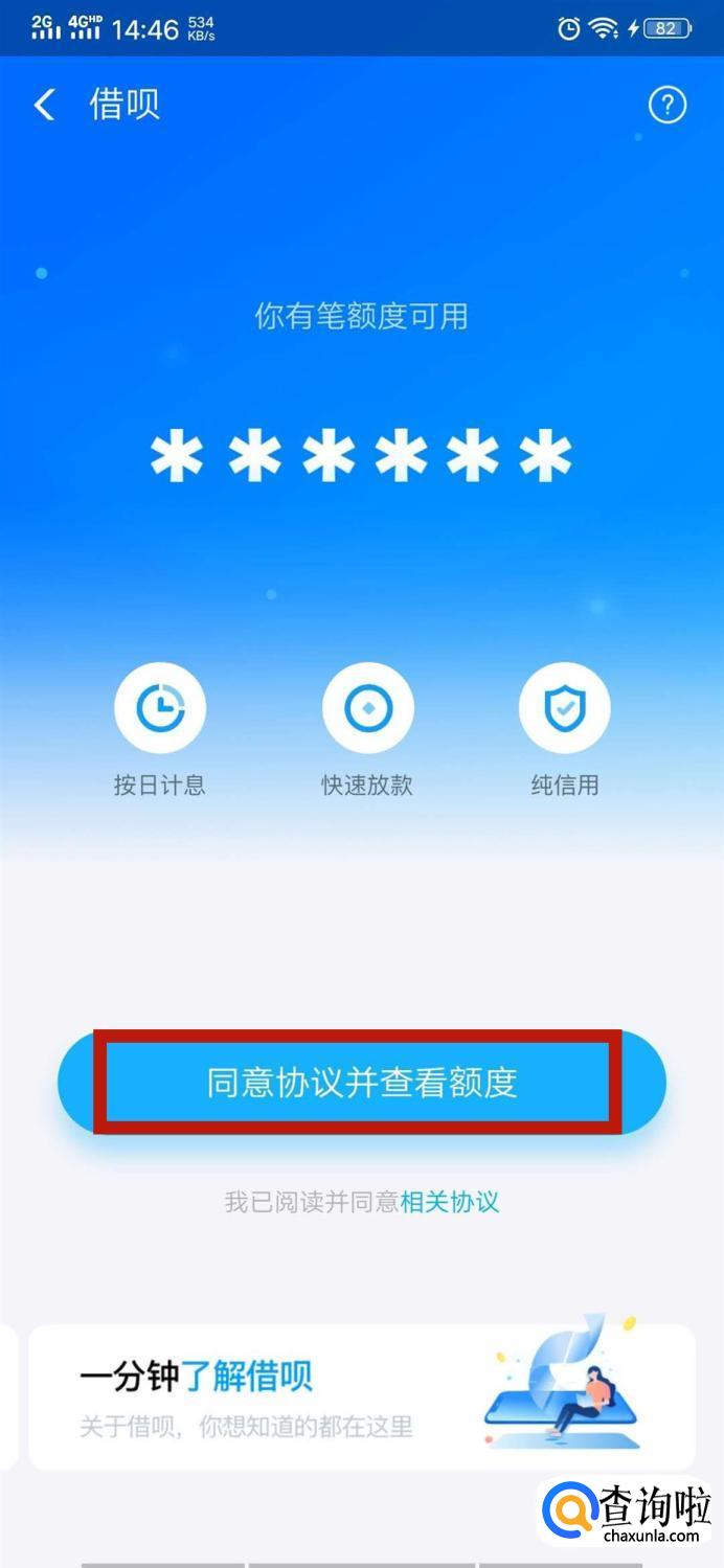 点击方框内“同意协议并查看额度”进行开通。