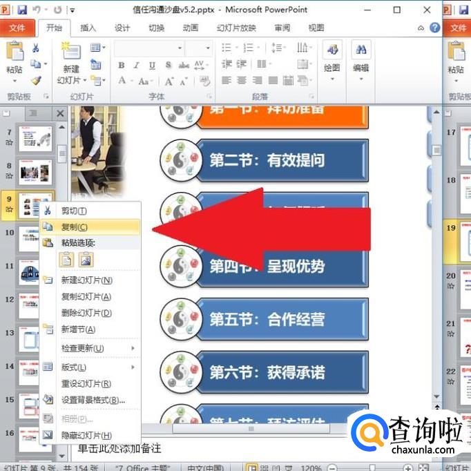 接下来单击鼠标左键选中需要复制的幻灯片,然后继续单击鼠标右键,在弹出的菜单选项中,点击“复制”。