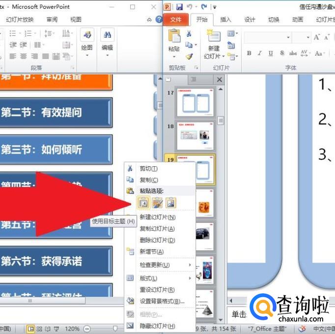 接着把鼠标移动到另一个PPT文件,单击鼠标左键选中粘贴位置的前一张幻灯片,然后继续单击鼠标右键,在弹出的菜单选项中选择“使用目标主题”粘帖即可。