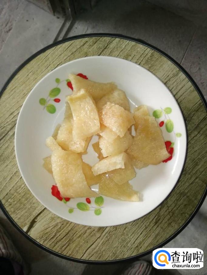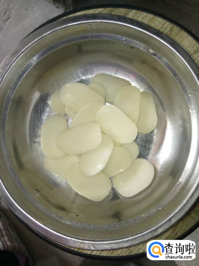 加点猪皮,味道很棒;将猪皮切成小块,洗净后,加点水泡软备用;年糕用来做煲里的配菜也很棒;将年糕片备好;