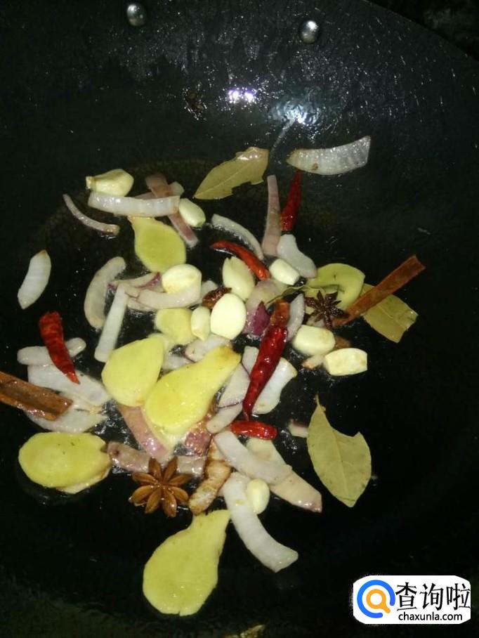 另起油锅,开火,加入适量的食用油,待油温升高,将洋葱和姜片入锅炒香;取几个干红辣椒、八角、桂皮、香叶洗净,放入锅里,一起炒出香味;