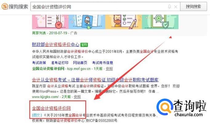 打开搜狗搜索,搜索“全国会计资格评价网”,点击官网链接,如图所示。