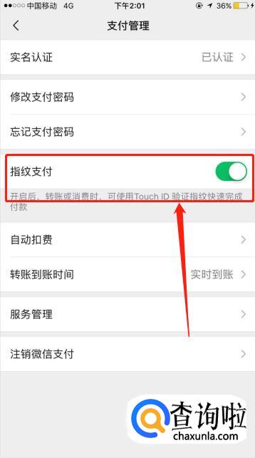 当密码输入完成后,再返回页面,这个时候就可以看到指纹支付已经是开启的。下次再使用微信支付的时候,就不会让你输入密码了。
