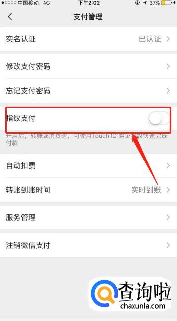 进入后,就可以看到指纹支付的相关设置。点击指纹支付,打开指纹支付功能。