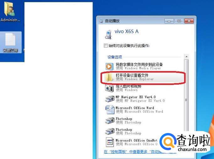 用数据线连接电脑和手机,电脑桌面上弹出如图提示,选择“打开设备以查看文件”,点击之后,进入手机内存。(我的是win7系统,如果手机和电脑不能正常连接的话,建议下载一个手机助手)