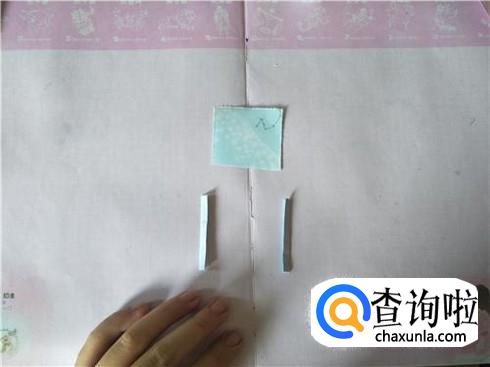 接着将其进行对折,在对折的地方折一个小的三角形,用力折叠,会出现一个折痕,然后再将其往里面进行翻折,另外再准备两张小纸片,折叠成一个狭长的长方形图形即可。