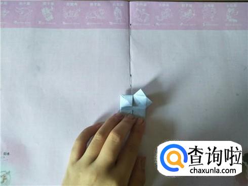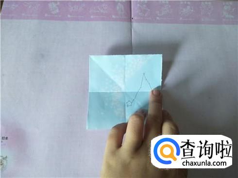 在折好的这个小正方形中,将四个角沿着折痕相交的中心点进行折叠,折叠之后会形成一个小正方形,然后将它翻到背面。