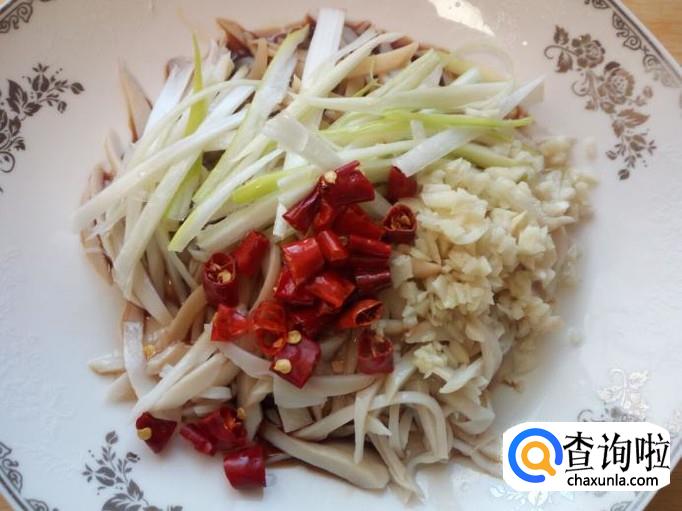 把切好的葱丝,蒜末,红干椒,摆放在淋完蒸鱼豆豉油的杏鲍菇上面。
