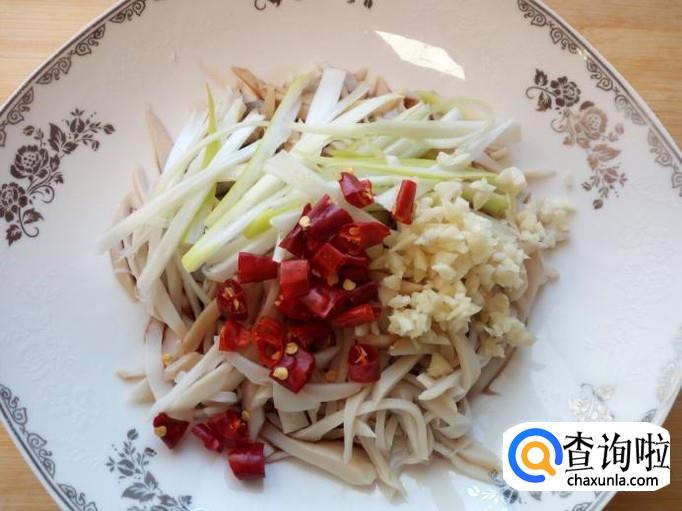 锅里放入油加热,油七,八成热时关火,把热油浇在装有杏鲍菇盘子里的调料上面即可。