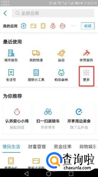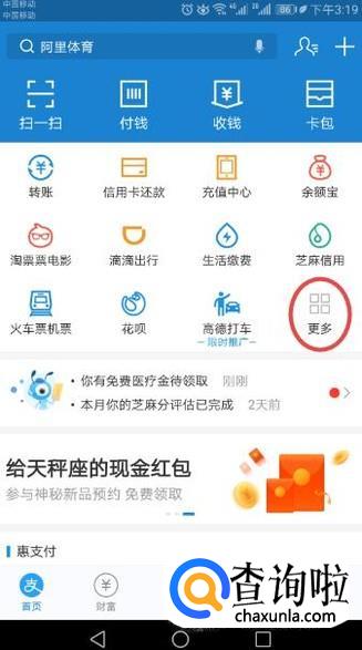 首先,我们打开我们的支付宝,然后我们点击更多;
