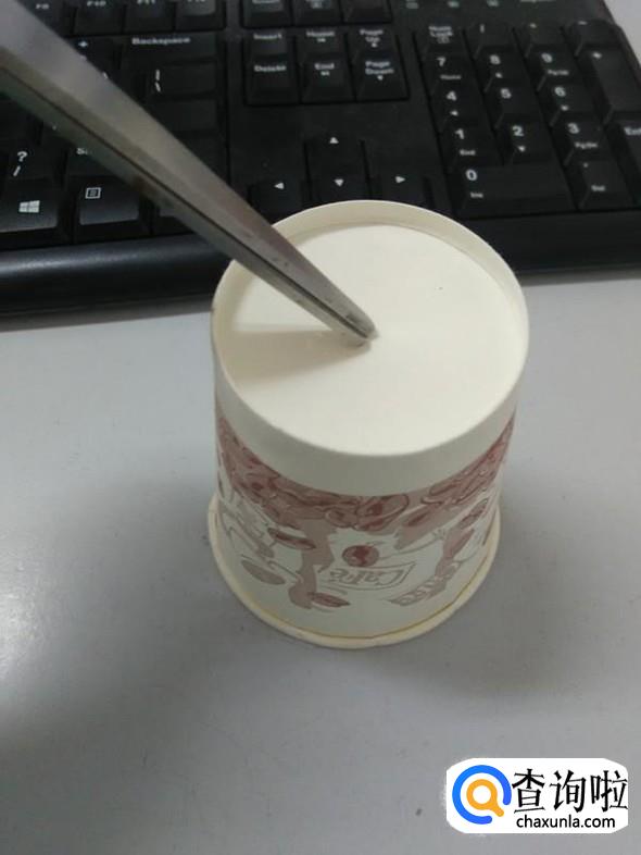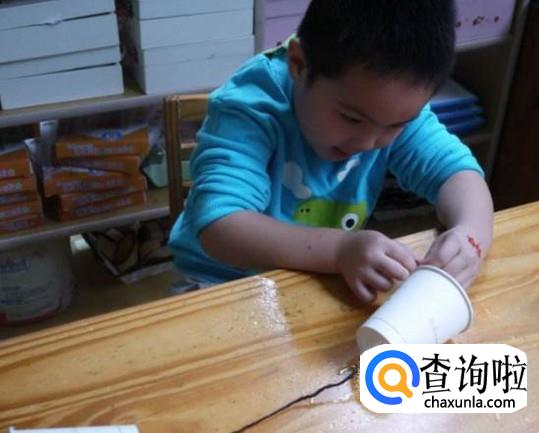 把绳子的两头分别从两个纸杯底部穿进去,然后在纸杯内打一个结。