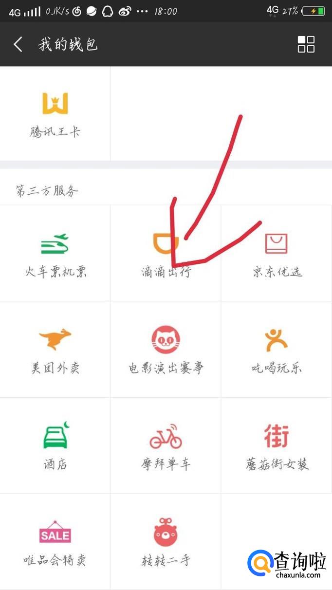 点击“钱包”这个选项,如图1箭头所示。会出现一个新的界面,如图2所示。向下滑动手机,点击“滴滴出行”选项,如图3箭头所示。