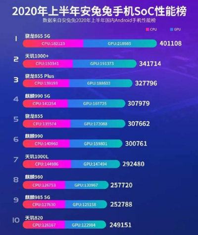 在2020.上半年Andorid手机处理器性能榜单中,高通的骁龙865处理器得分401108分,排名第一,其中CPU得分182123分, GPU得分218985分;排名第二是联发科最新旗舰芯片天现1000+ , CPU得分150341分, GPU得分191373分;排名第三的是2019年发布的骁龙855 Plus处理器,而华为麒麟9905G芯片仅排名第四, CPU得分142254分, GPU得分165725分。天玑1000+和华为麒麟990、高通骁龙865对比,三款芯片差距不是很大,天现1000+单核跑分已经和麒麟990 5G不相上下,多核跑分与另外两款芯片也没有太大差距,三款芯片都是旗舰配置。