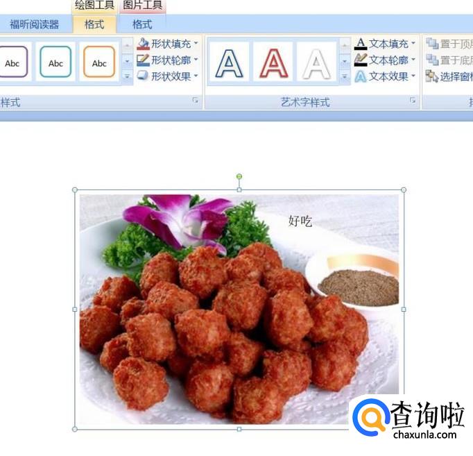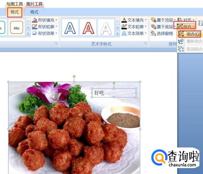 然后我们画一个文本框,之后输入文字,然后选中文本框和图片,之后我们点击工具栏中格式,然后点击组合,弹出的界面,再点击组合;