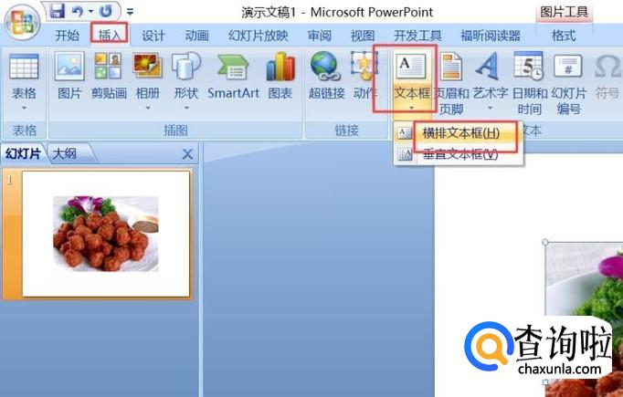 插入图片完成后,我们点击插入,之后点击文本框,然后点击横排文本框;