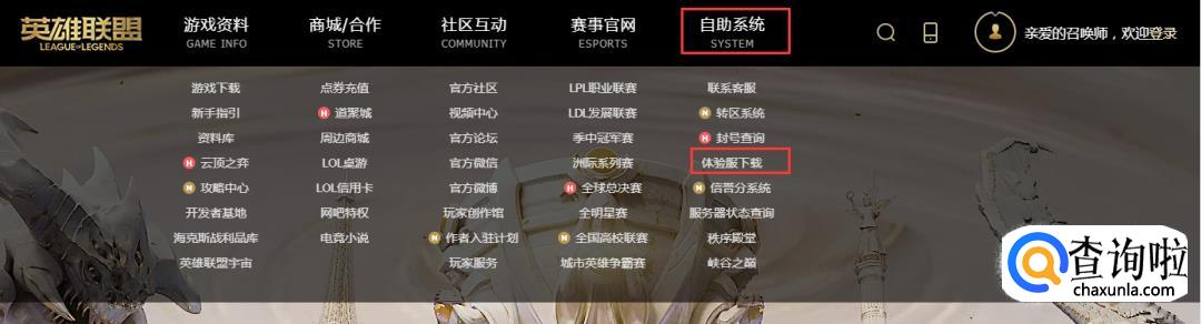 进入官网后点击【自助系统】,选择【体验服申请】,选择【体验服和比赛服】,点击【体验服】下载。