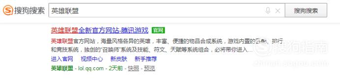 首先打开搜狗浏览器,搜索【英雄联盟】,找到官网点击进入。