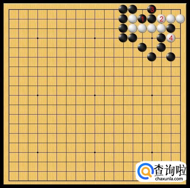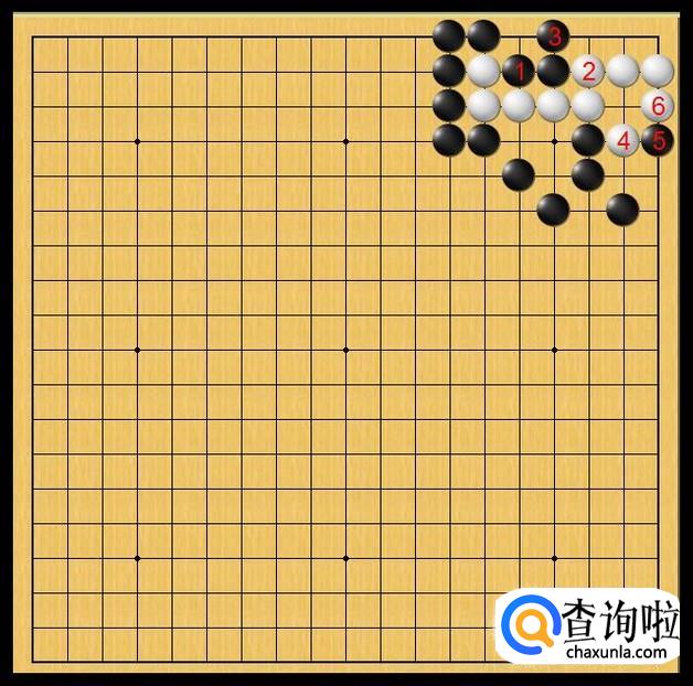 白棋急忙在白4处落子,白4断打右上角下方底边上的黑一子,白棋试图通过打吃掉黑一子后做起另外一个眼。如图所示。