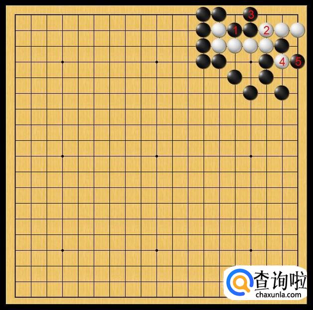 黑棋并没有按照白棋预想的在二路打吃白4的方式走起,黑棋是在底边黑5处打吃白4,黑棋的这个打吃让白棋很难过。如图所示。
