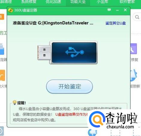 下载完了之后我们就可以插上我们的U盘进行坚定了,要注意360只能鉴定空的U盘,我们可以提前将文件转移。