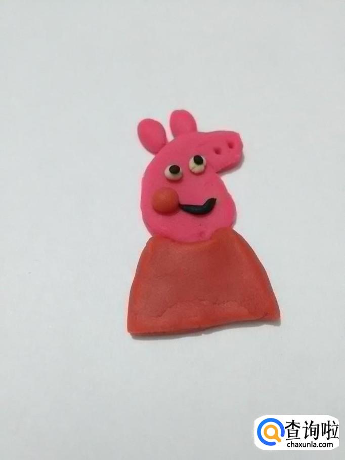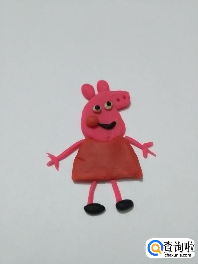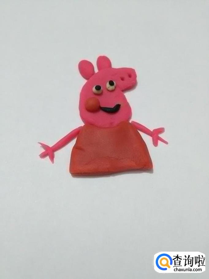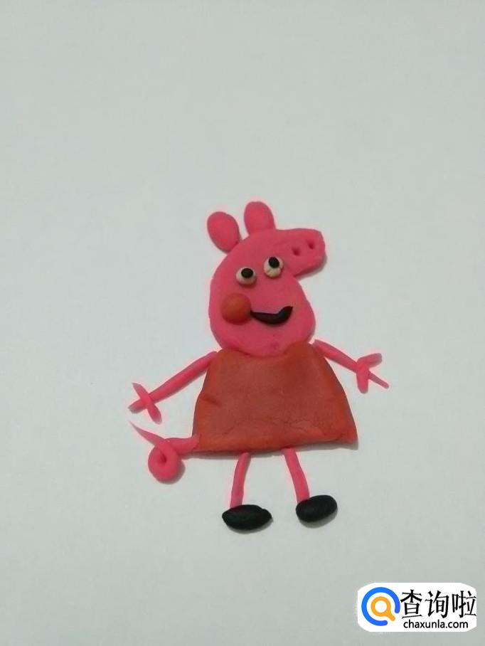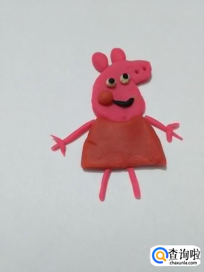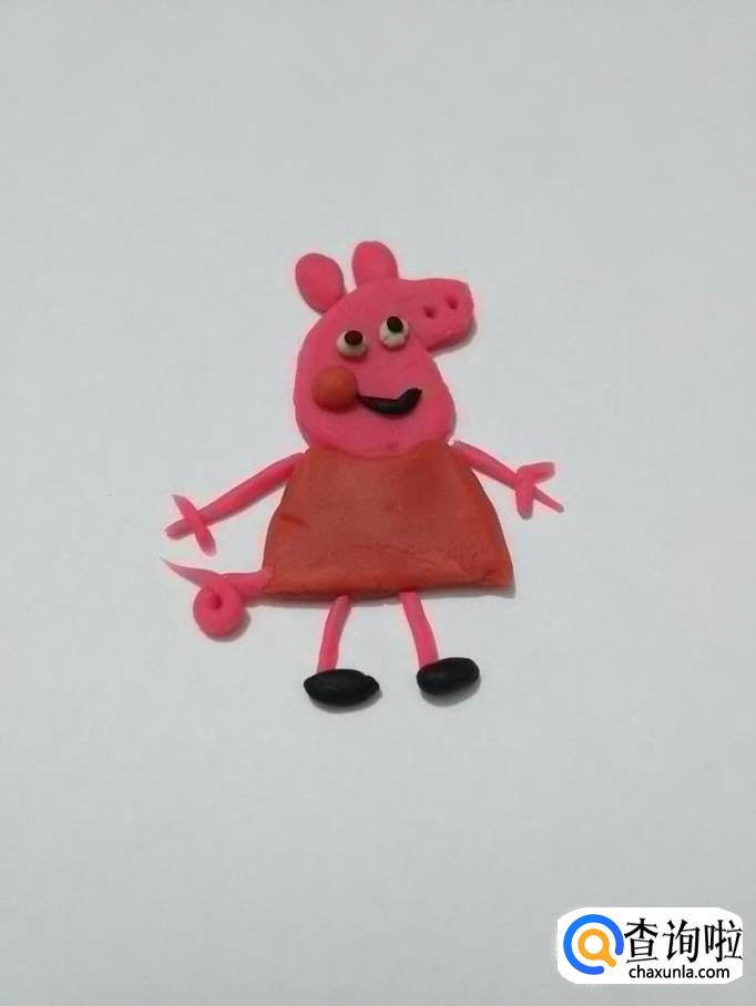 再从粉长条上取一段,一端搓细,并打个圈,粘在裙子左侧,当作佩奇的尾巴。小猪佩奇就做完了。