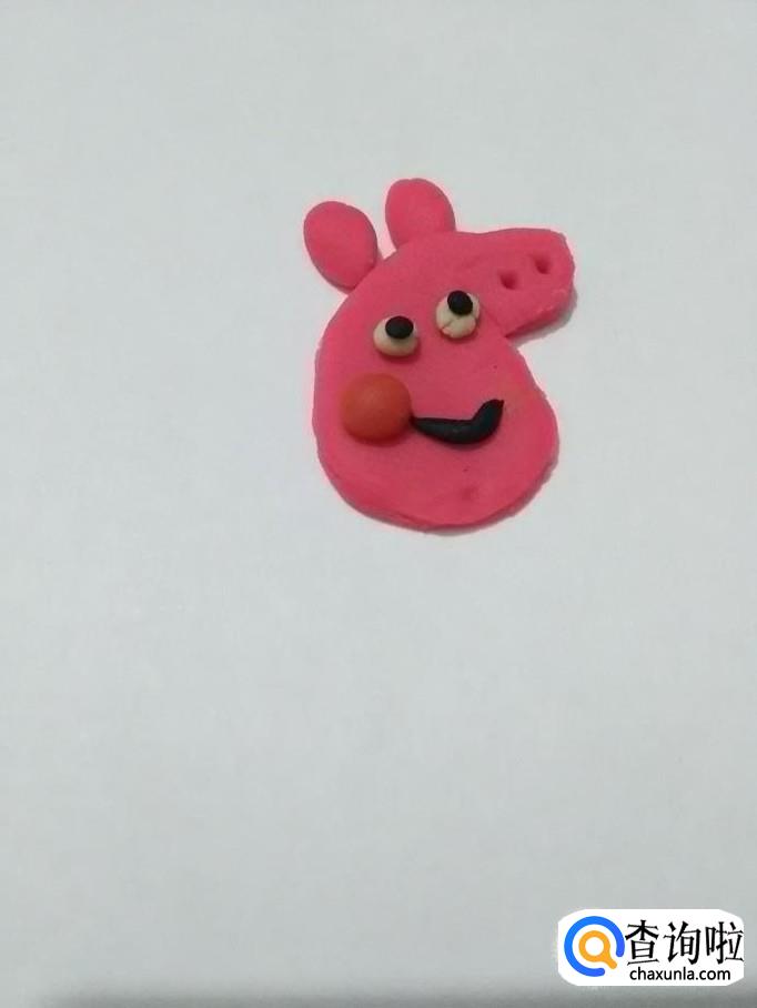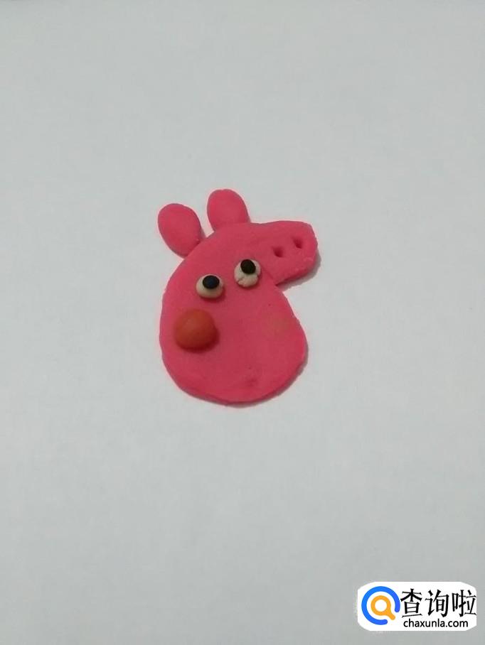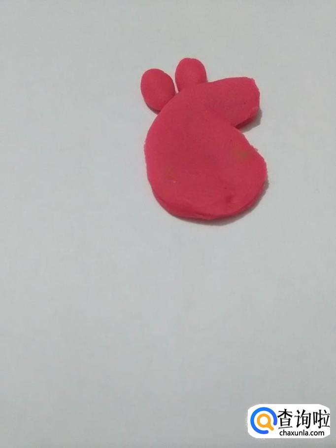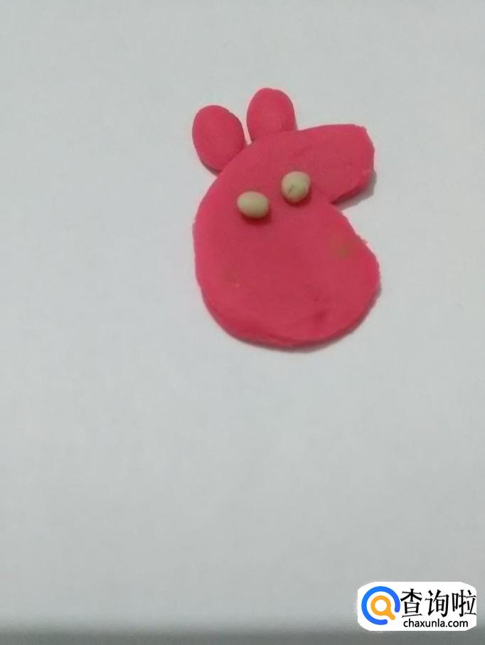 用粉色团两个椭圆形,粘在头上,当作两只耳朵。