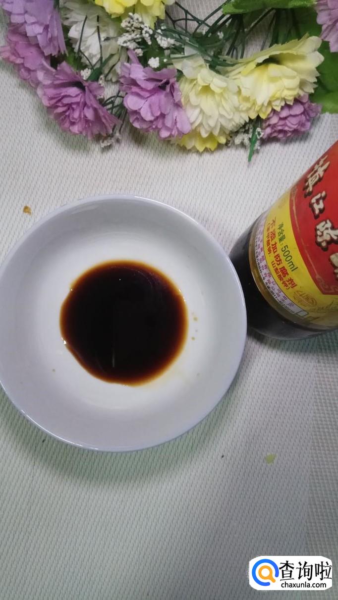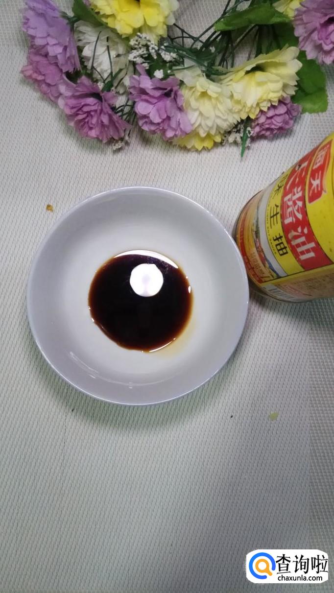 准备浇汁,碗中放入适量生抽,少量陈醋。生抽本身带咸味儿,放了生抽就不用加食盐了,陈醋的量也不能太多,太多的话容易发酸。也不能不放,少放一些可以提鲜。