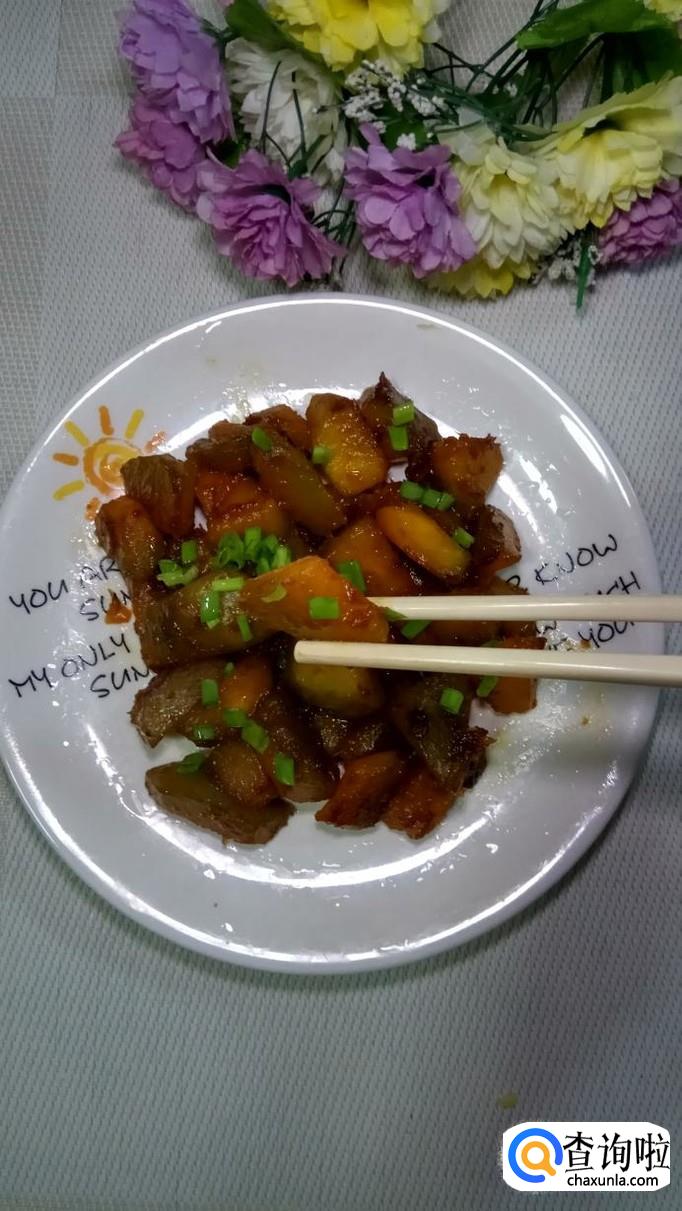 汤汁收干后,将南瓜盛出放入盘中。