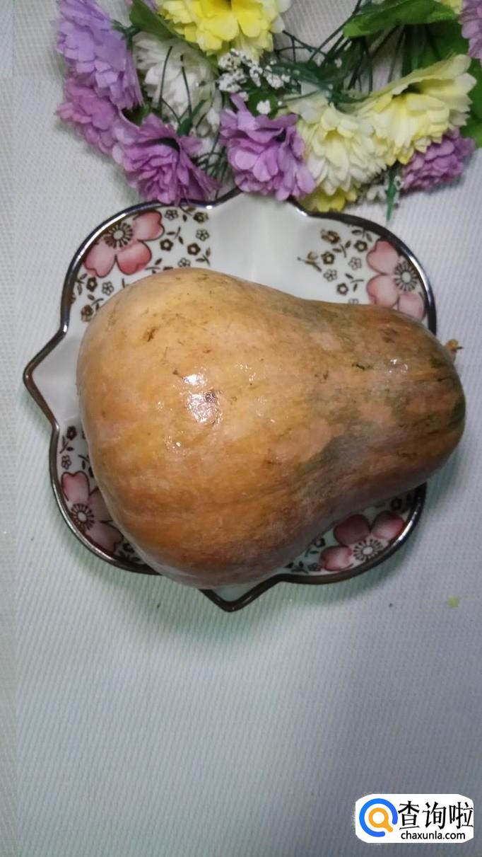 准备一个小南瓜,洗净去皮,切成块,放入盘中备用,如图所示,注意,南瓜块不能切得太小,否则容易散,也不能太大,否则太难熟。