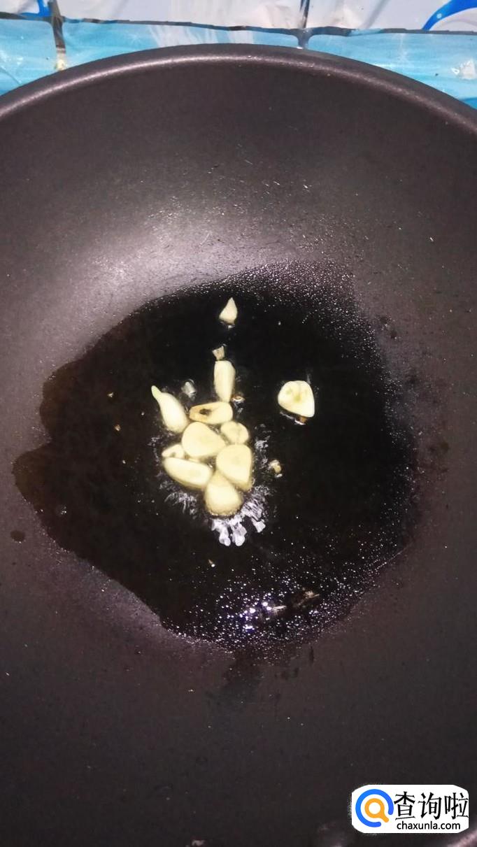 炒锅中放入适量油,油热后放入蒜片爆香,看到蒜片微微发黄就可以了。